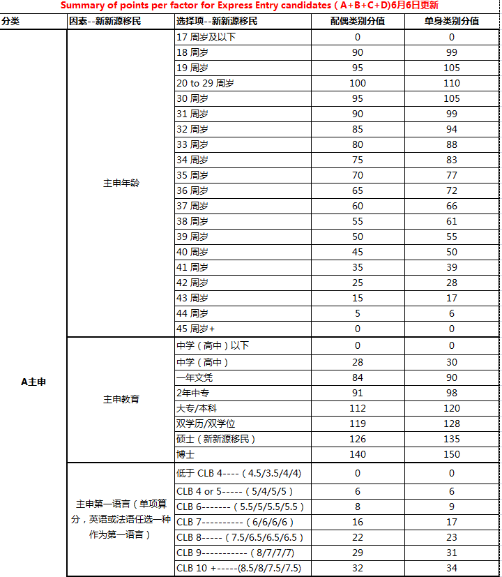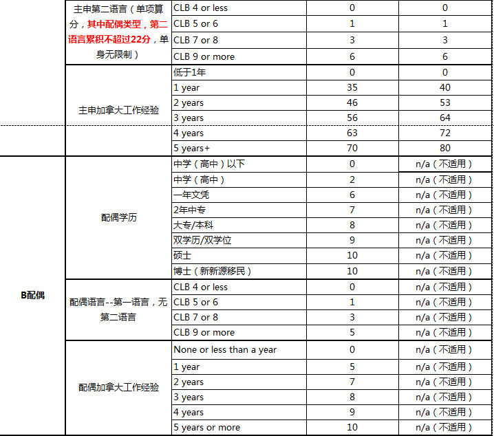 加拿大联邦Express Entry Comprehensive Ranking System 1200分评分表