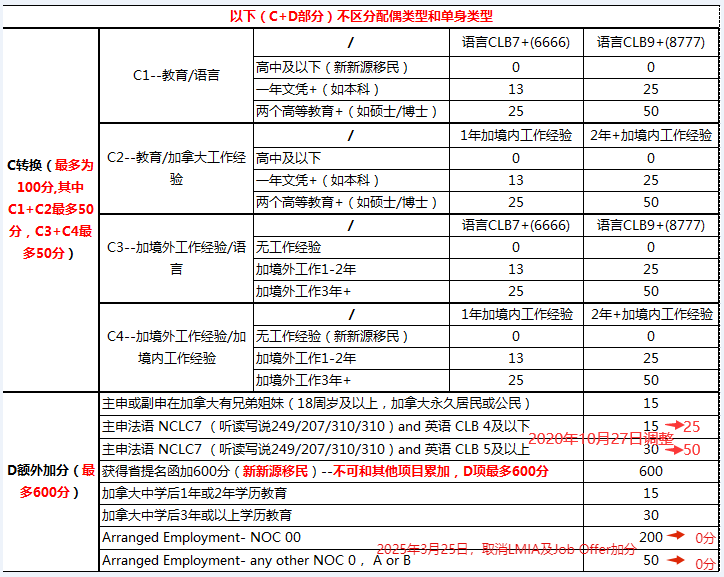 note:2025年03月25日后,原先打分表中的D项的LMIA及Job Offer(Arranged employment)打分取消。