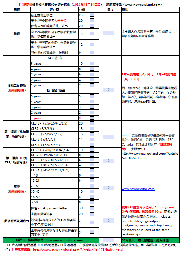 附件为自动评分表:(萨省2020年11月24日更新评分标准,截止到2025年为最新版)