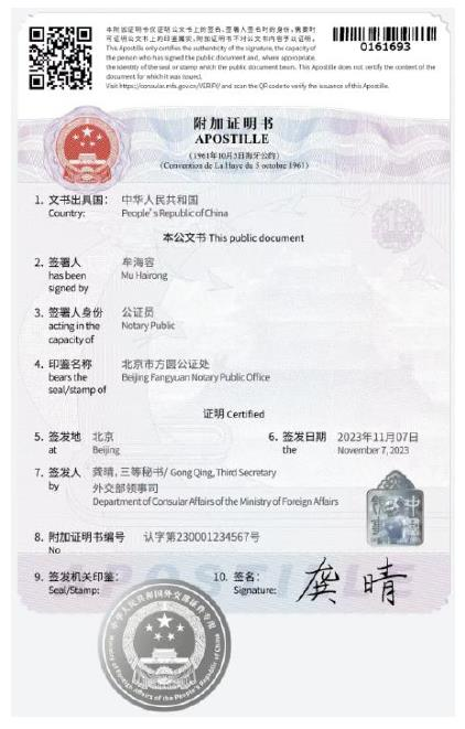2023年3月8日,中国加入《取消外国公文书认证要求的公约》(Convention Abolishing the Requirement of Legalisation for Foreign Public Documents,下称《公约》)。2023年11月7日,《公约》在中国生效实施。此后,中国同《公约》缔约国之间公文书跨境流转不再经过传统的“外交部门认证+使领馆认证”的“双认证”程序,而是在《公约》框架下启用基于“附加证明书”(Apostille)的一步式证明新模式,这将大幅节省中外公民和企业的办证时间和经济成本。