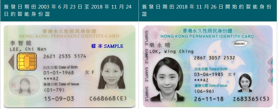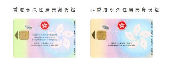 香港居民身份证和香港永久居民身份证(新智能身份证)的样式如下(新新源移民):