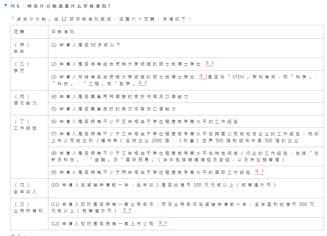 「综合计分制」设有申请资格门槛,只有达到申请资格门槛的申请人才能经网上递交申请。有兴趣申请的人士应先评估其个人资历是否已达到申请资格门槛,才提交申请。申请资格门槛或会不时更改而不作事先通知。现行的申请资格门槛为符合12个评核准则的其中6个。