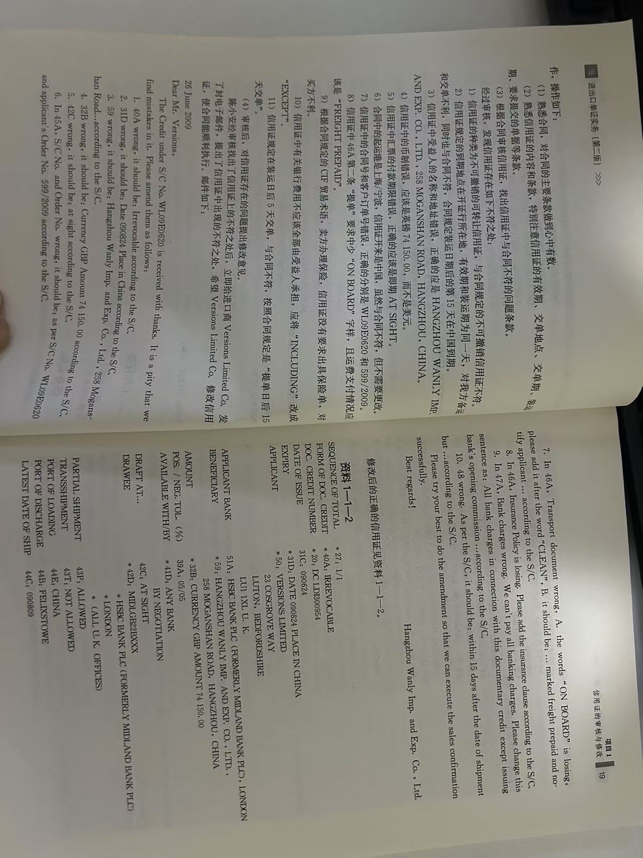 2. 信用证上的审查要点包括双方的公司名啊,品名,内容,交期,运输方式,需要的单证这些相信你也在网上查到很多了,我也就不多说了。注意一下单证上有没有要求什么什么机关或者团体背书或者验货结果之类的文件 要求,这些比较不可控的因素会影响你们的最后交单。当然,这些内容一般在开证申请上会出现,银行业会提点你的。