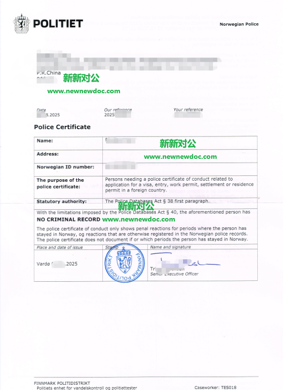Norway挪威无犯罪记录Criminal Records Certificate (Politiattest)